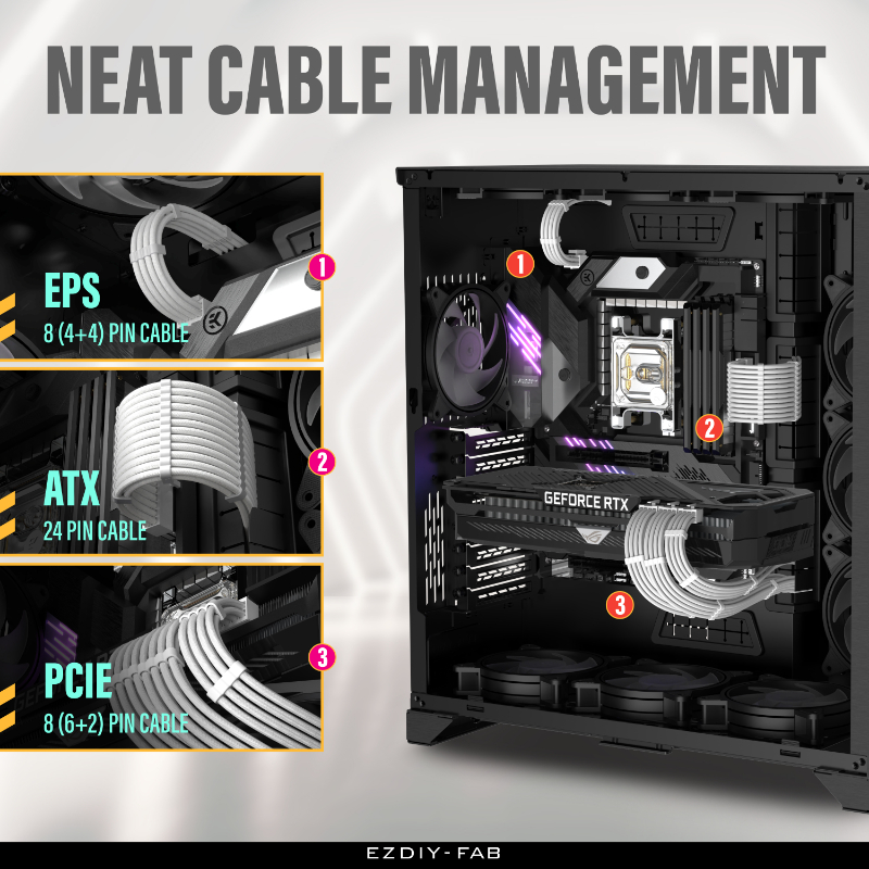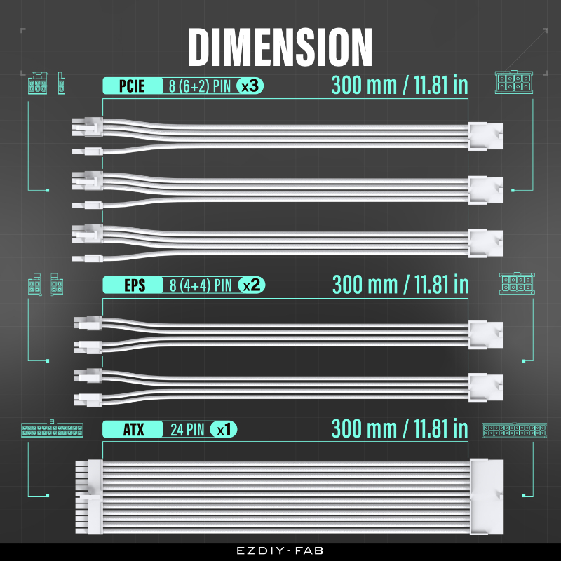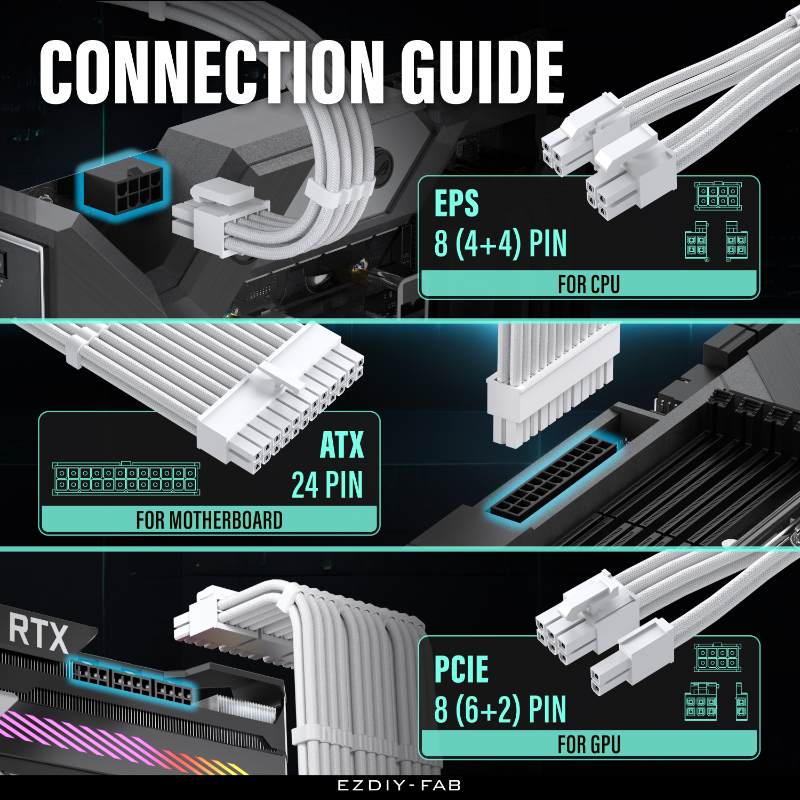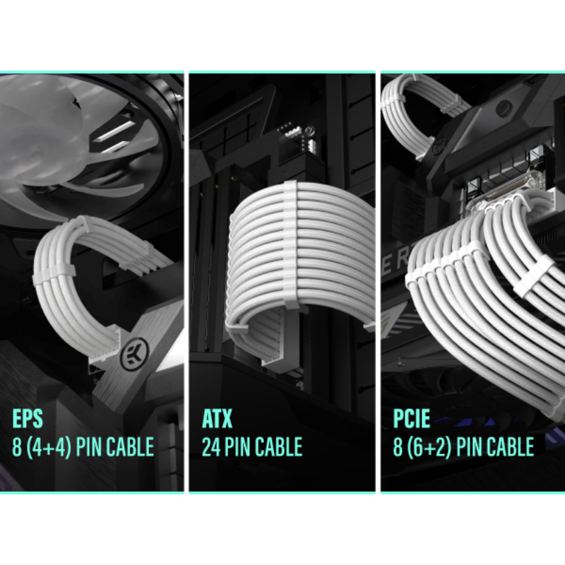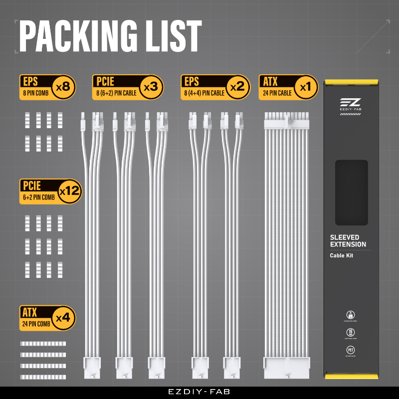 Give your PC a showroom finish with EZDIY-FAB’s all-white sleeved PSU extension kit. Each cable uses thick 16AWG tinned copper for low resistance and stable power delivery—even with high-wattage PSUs—while the flexible nylon braid and included cable combs make routing tidy and effortless. Designed as extensions, this kit works with any modular or non-modular power supply for a seamless upgrade to both airflow and aesthetics.