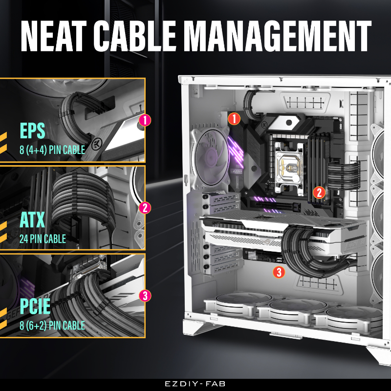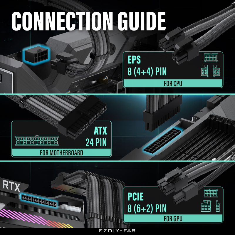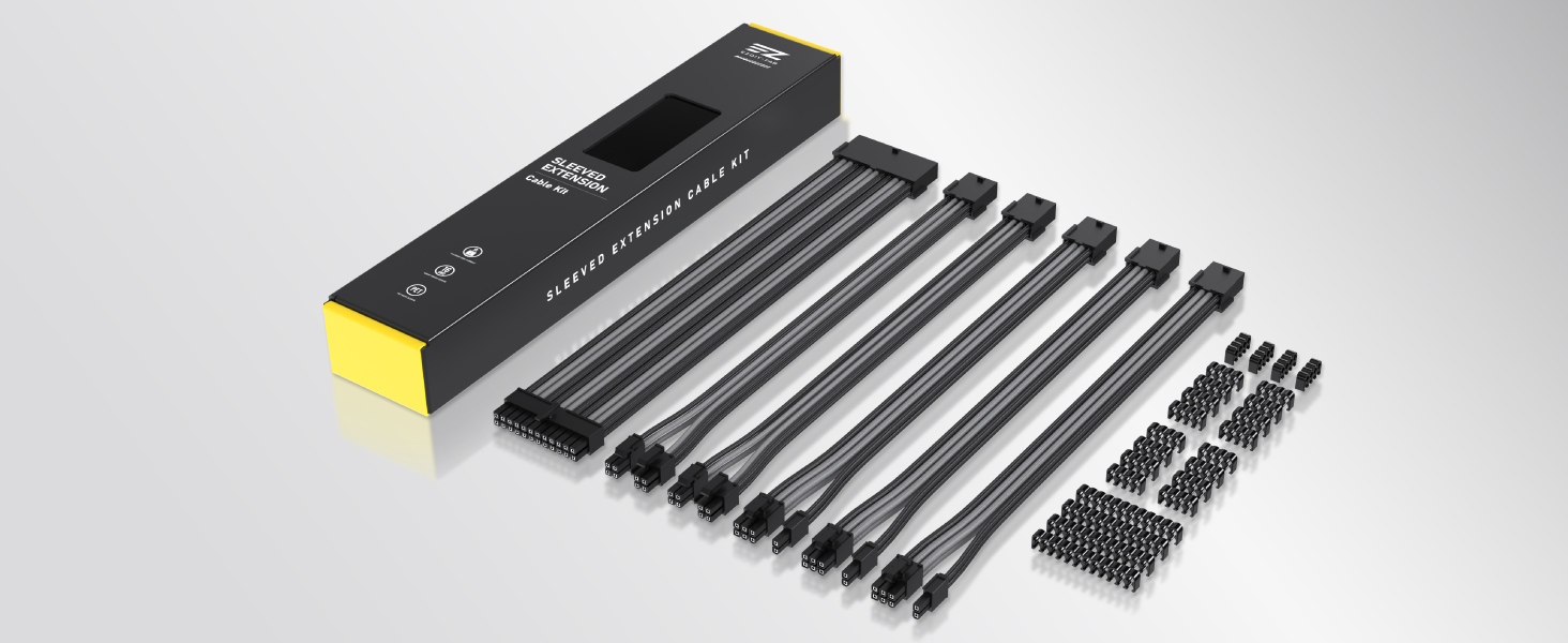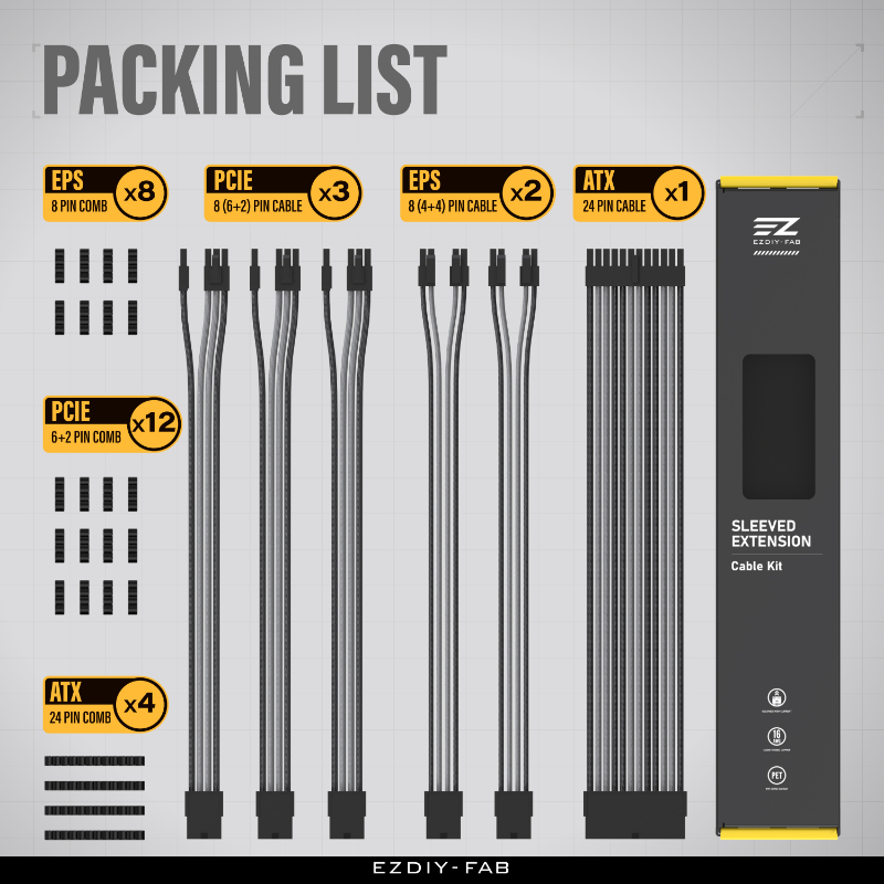 Upgrade cable management and aesthetics with EZDIY-FAB’s 16 AWG nylon-braided extension kit. These low-resistance, tinned-copper extensions support high-wattage PSUs while the dense sleeving and included combs keep runs straight, tidy, and airflow-friendly.