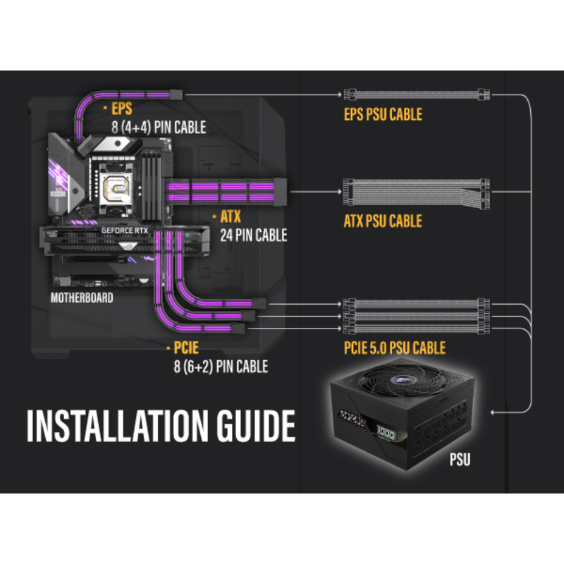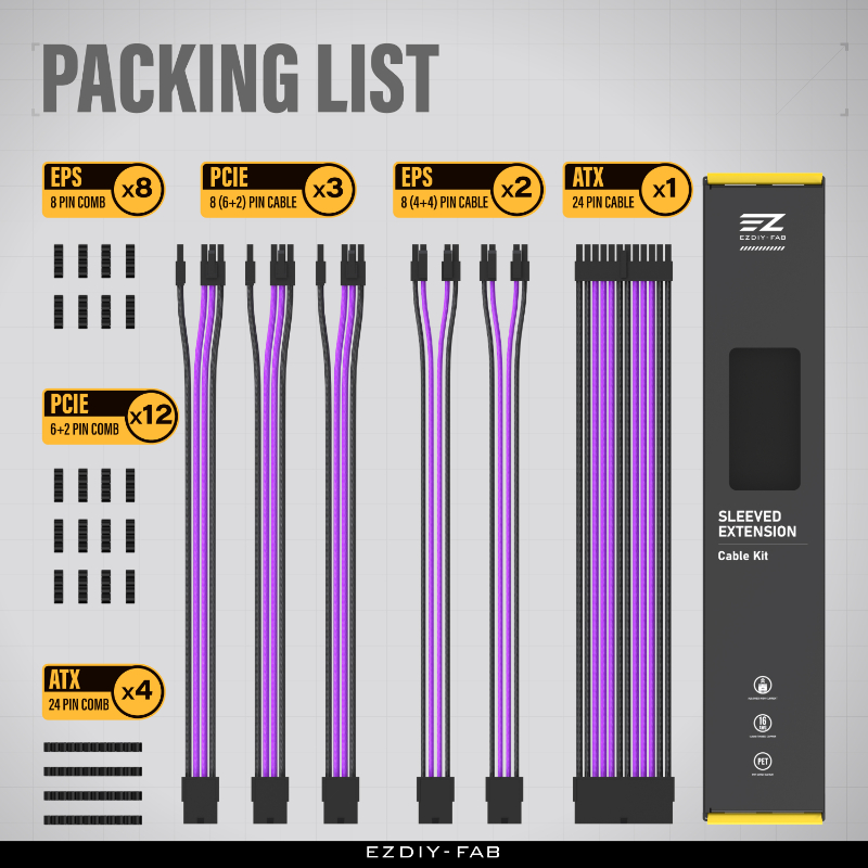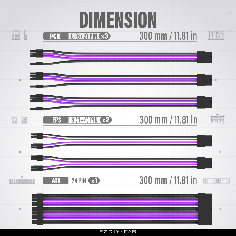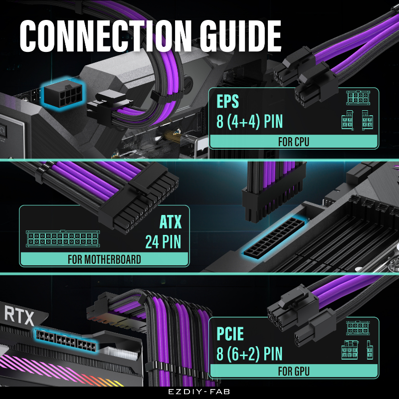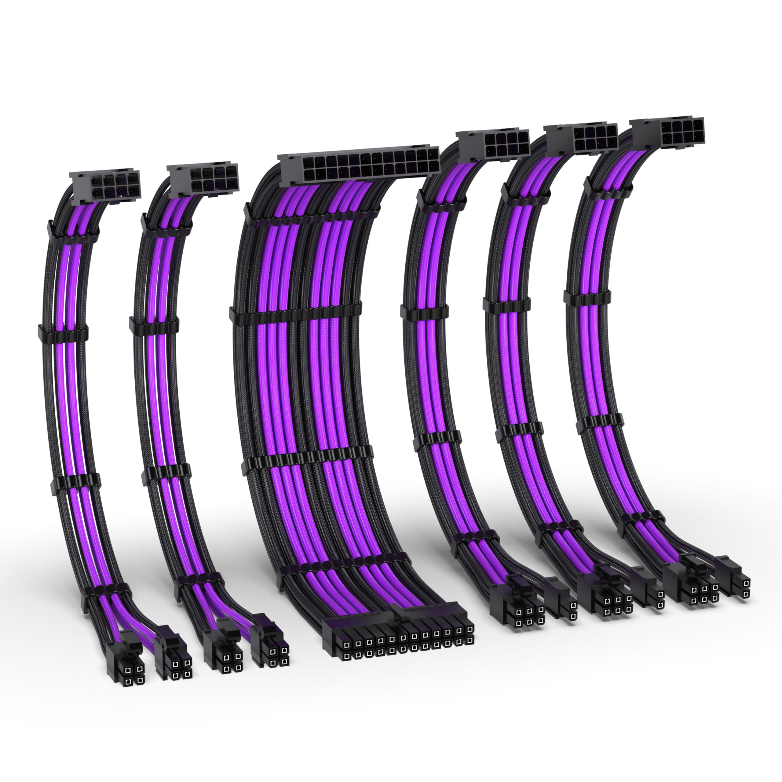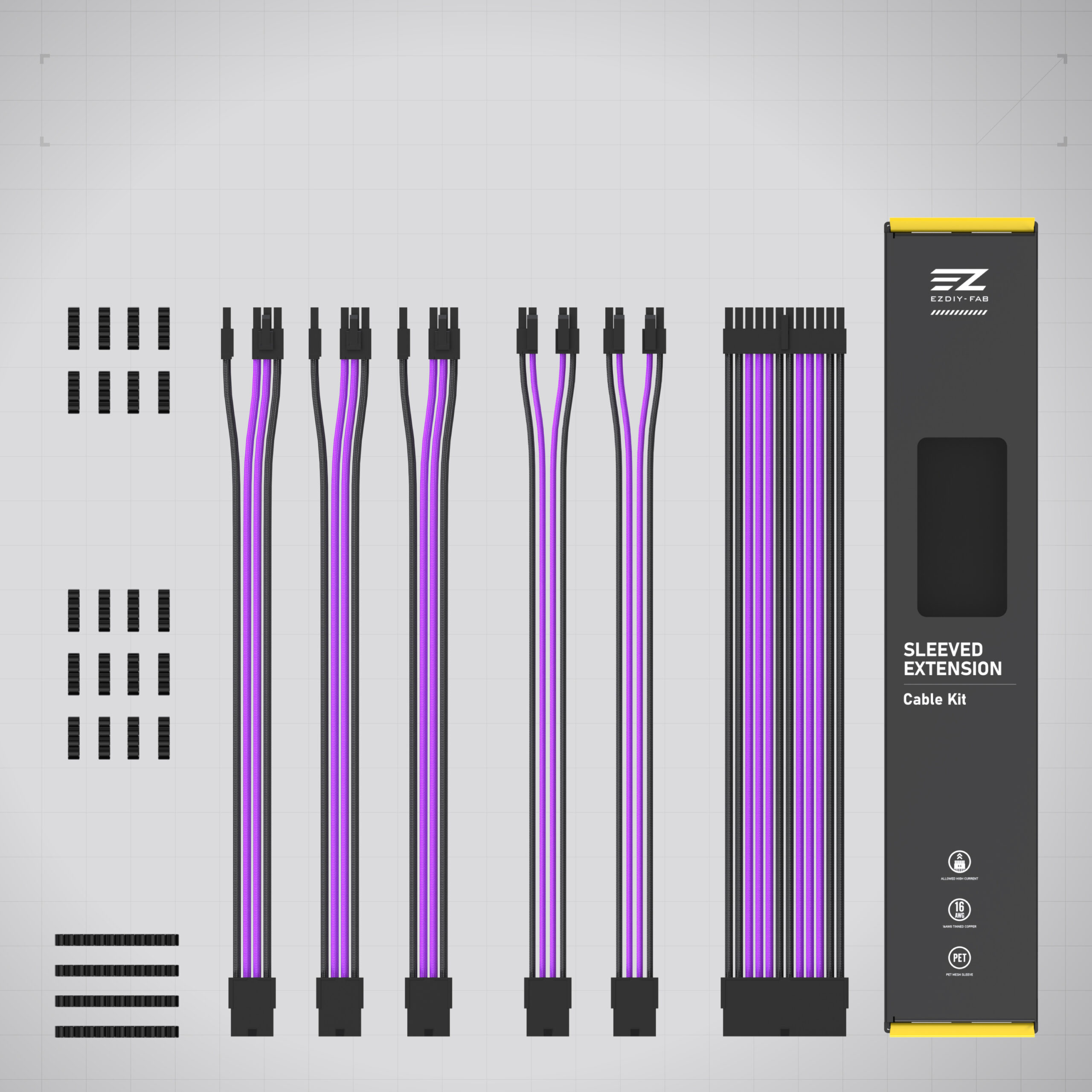 EZDIY-FAB 16 AWG PSU Premium Nylon Sleeved Extension Cable Kit – Black/Purple