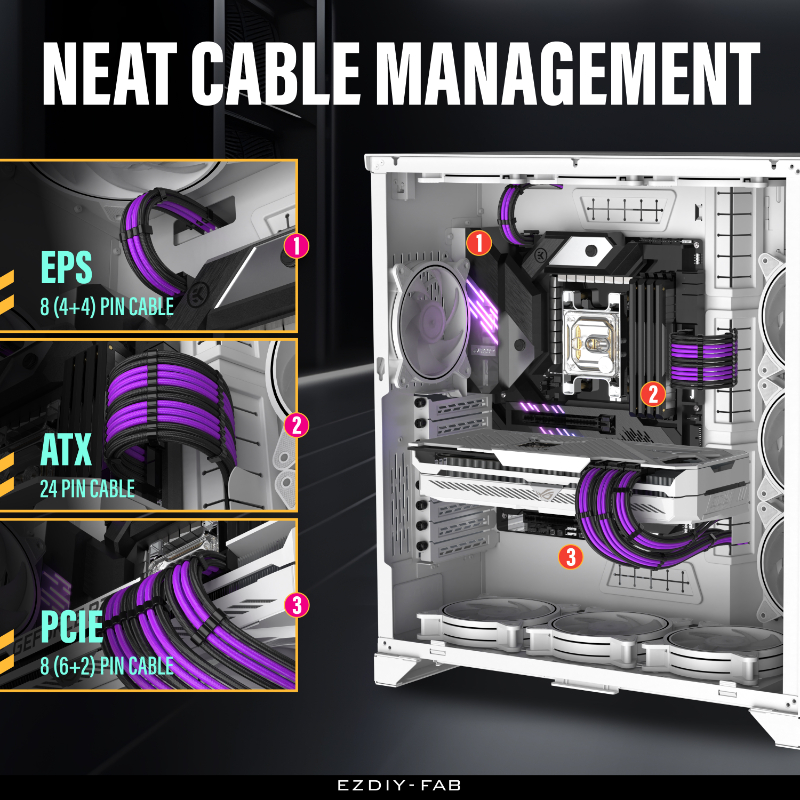 Upgrade cable management and aesthetics with EZDIY-FAB’s 16 AWG nylon-braided extension kit. These low-resistance, tinned-copper extensions support high-wattage PSUs while the dense sleeving and included combs keep runs straight, tidy, and airflow-friendly.