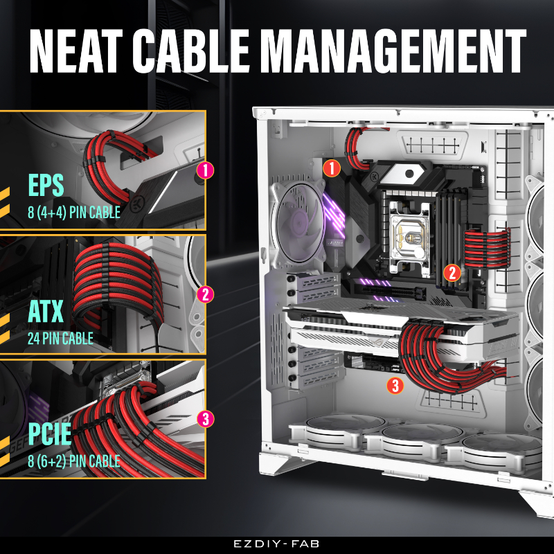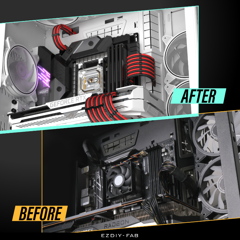 Upgrade cable management and aesthetics with EZDIY-FAB’s 16 AWG nylon-braided extension kit. These low-resistance, tinned-copper extensions support high-wattage PSUs while the dense sleeving and included combs keep runs straight, tidy, and airflow-friendly.