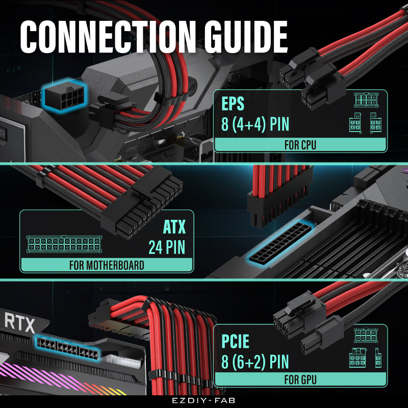 EZDIY-FAB 16 AWG PSU Premium Nylon Sleeved Extension Cable Kit – Black/Red