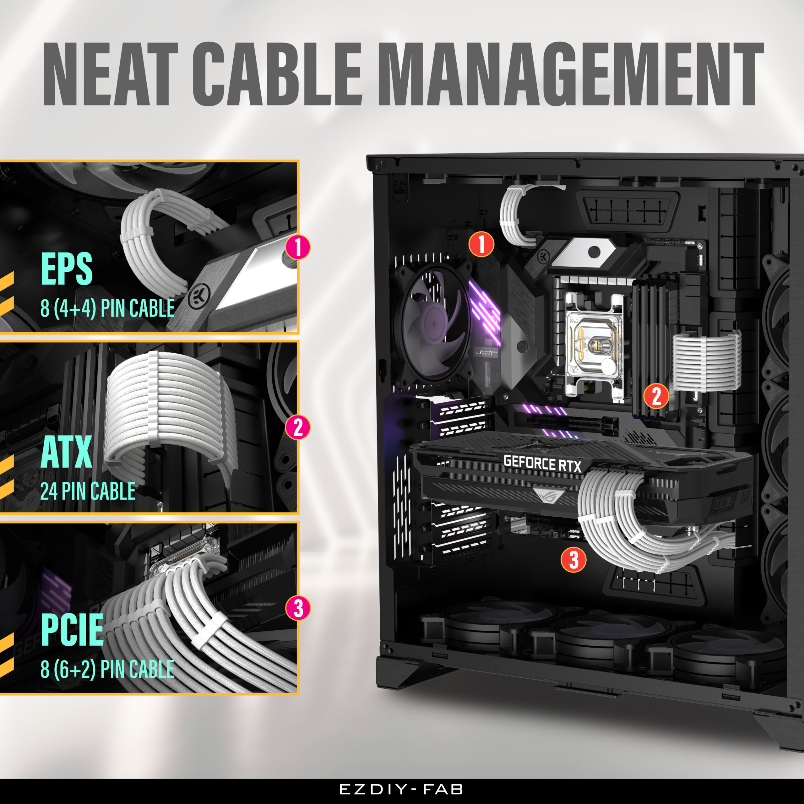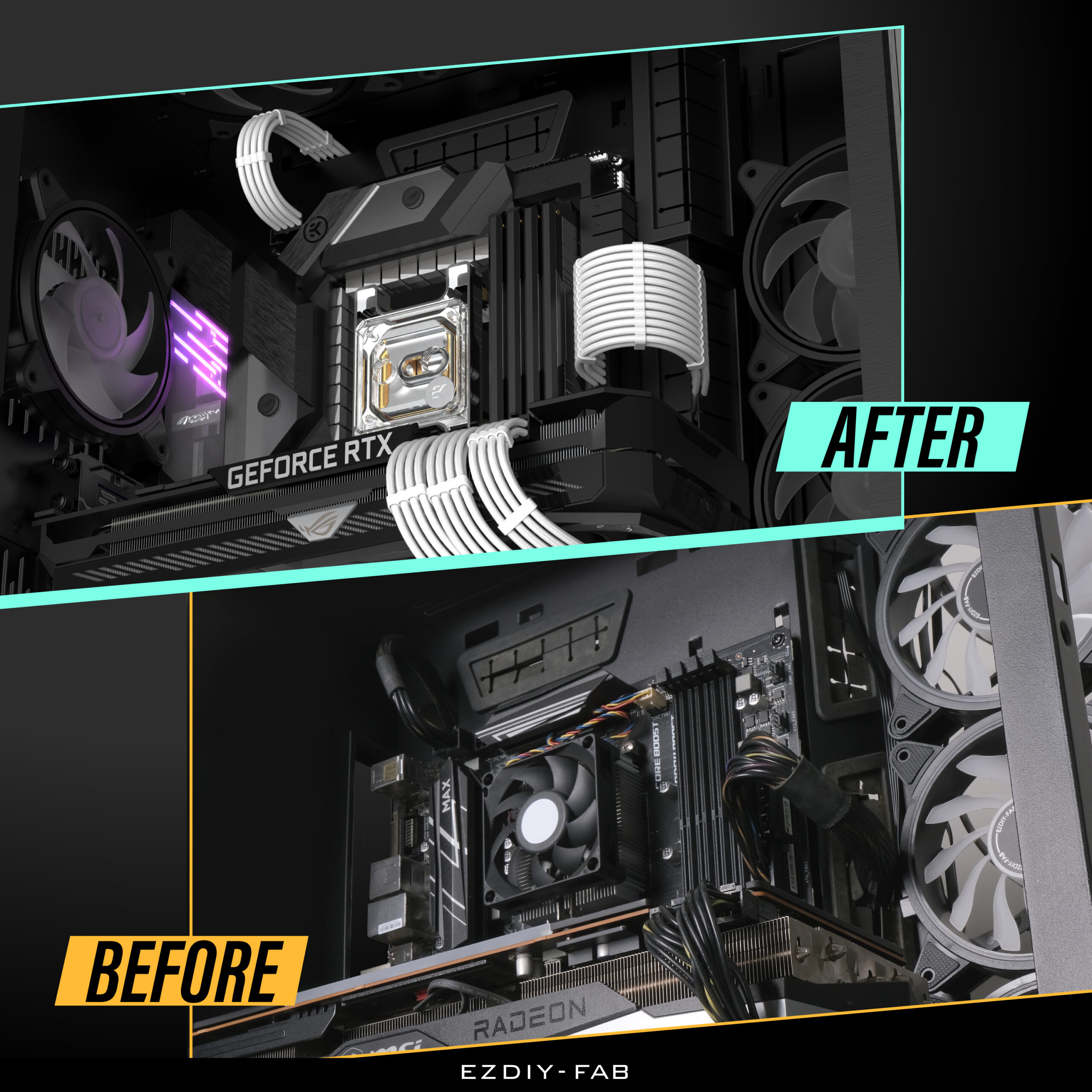 Upgrade cable management and aesthetics with EZDIY-FAB’s 16 AWG nylon-braided extension kit. These low-resistance, tinned-copper extensions support high-wattage PSUs while the dense sleeving and included combs keep runs straight, tidy, and airflow-friendly.